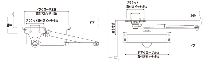 ・ドアクローザはメーカーや機種によって取り付けネジ位置が異なりますが、本シリーズのPSX-2・PSX-3は、取り付け板に複数の取り付け穴が空いており、さまざまなネジ位置に対応出来るようになっています。他社メーカー数種類のドアクローザにおいて、同じ取り付けネジ位置で交換ができます。